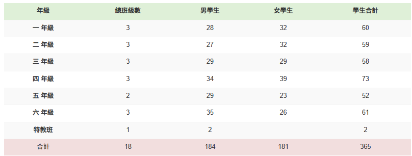 學校班級數:普通班 17 班、特教班 1 班、 資源班 1 班、幼兒園 1 班