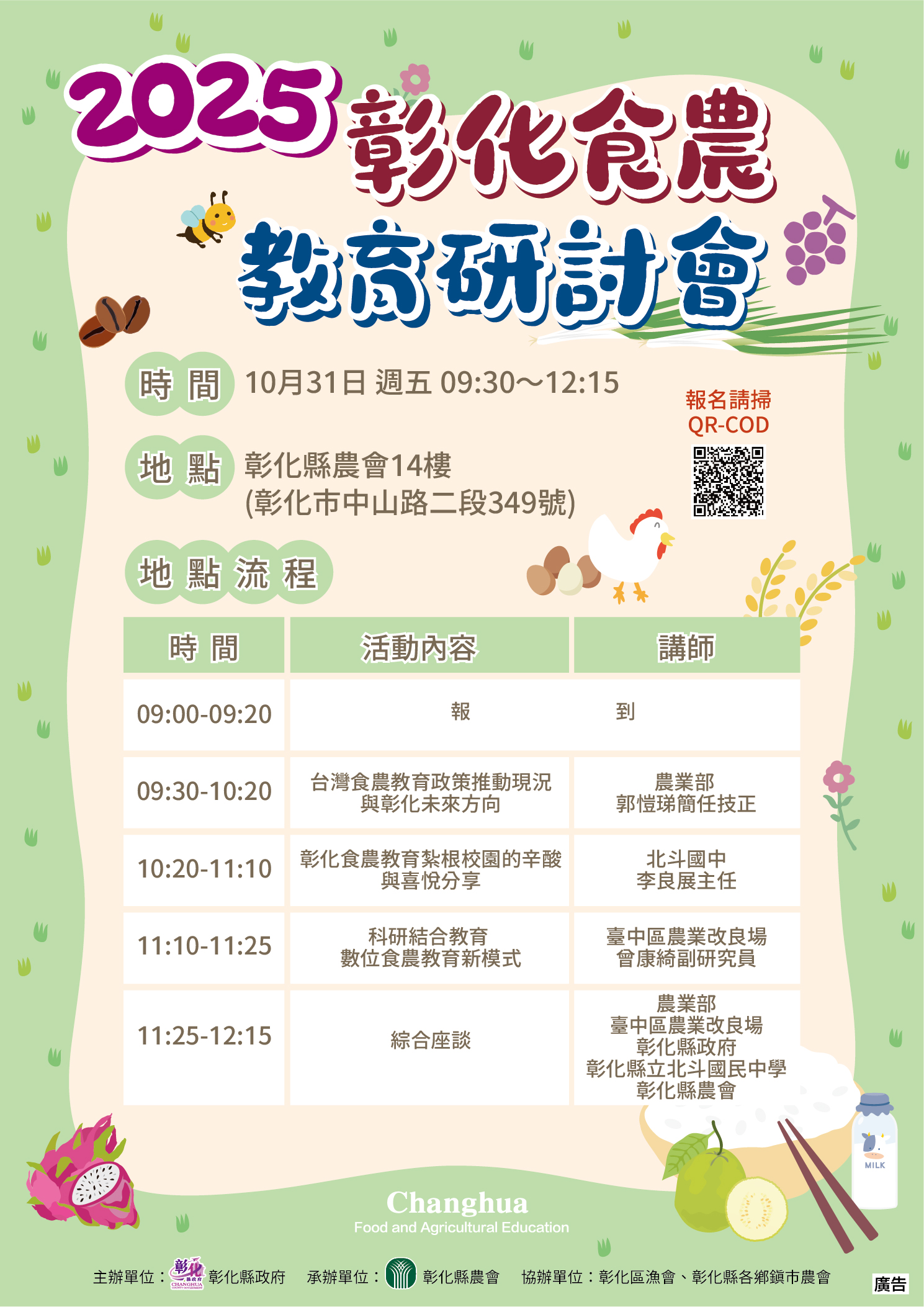 | 主旨: | 有關本府訂於10月31日(星期五)上午9時0分假彰化縣農會14樓會議室辦理「2025彰化食農教育研討會」,請貴校鼓勵推動食農教育所屬教師與會,並請惠予公(差)假登記,請查照。 |