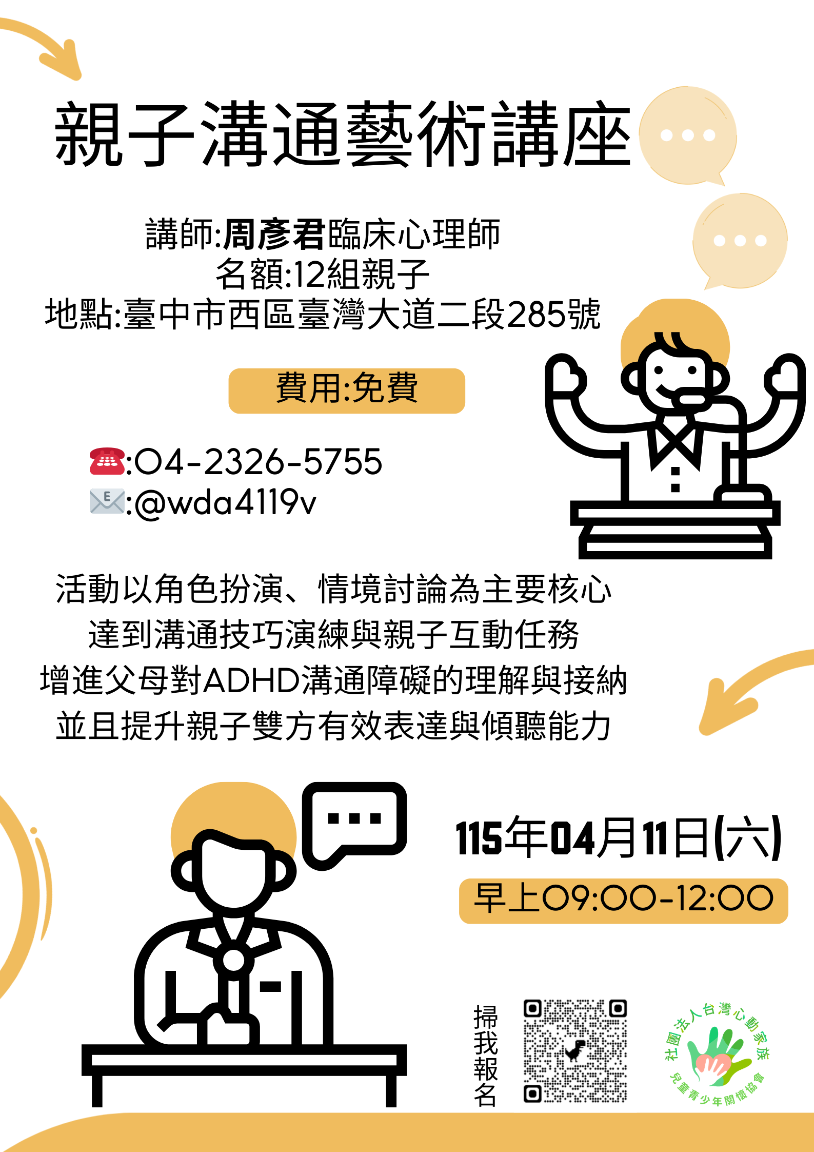 本會長期關注注意力不足過動症(ADHD)兒童青少年之心理健康與人際適應議題,規劃辦理一系列免費之教師研習及家長教育活動。 |