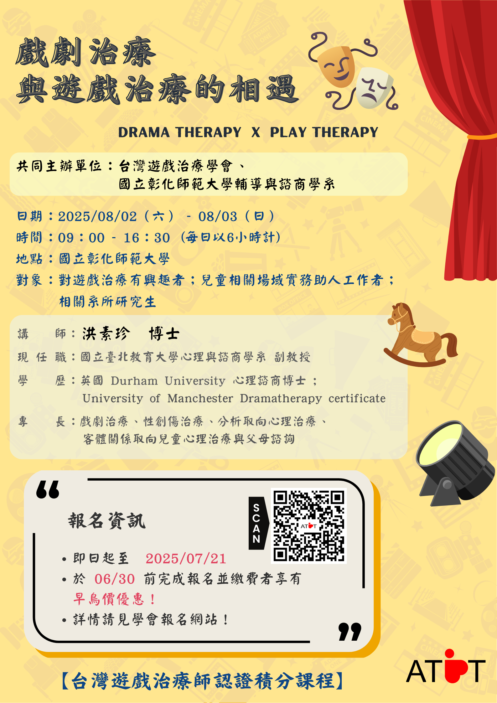 | 主旨: | 本會與國立彰化師範大學將於114年8月02、03日共同舉辦【台灣遊戲治療師認證積分課程】戲劇治療與遊戲治療的相遇,詳情如說明及附件,敬請貴單位協助張貼宣傳與鼓勵貴單位相關人員參加。 |