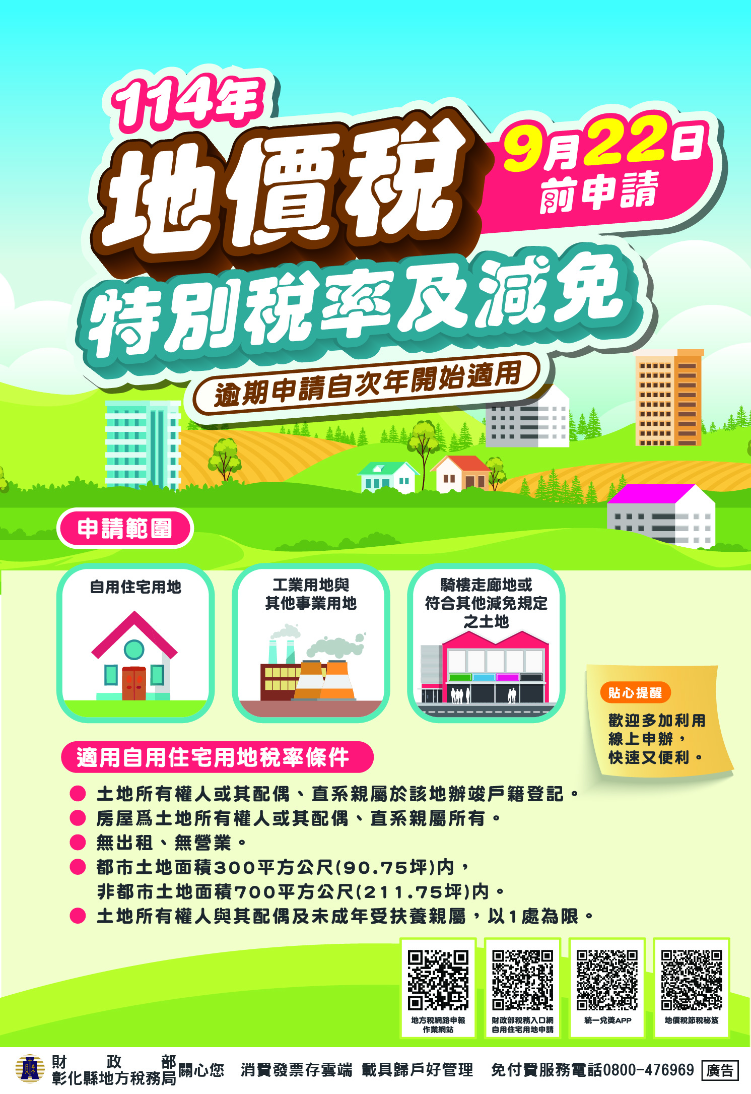 (二) | 託播內容:114年適用地價稅特別稅率及減免,請於9月22日前提出申請當期即適用,逾期申請自次年開始適用,彰化縣地方稅務局關心您。 |