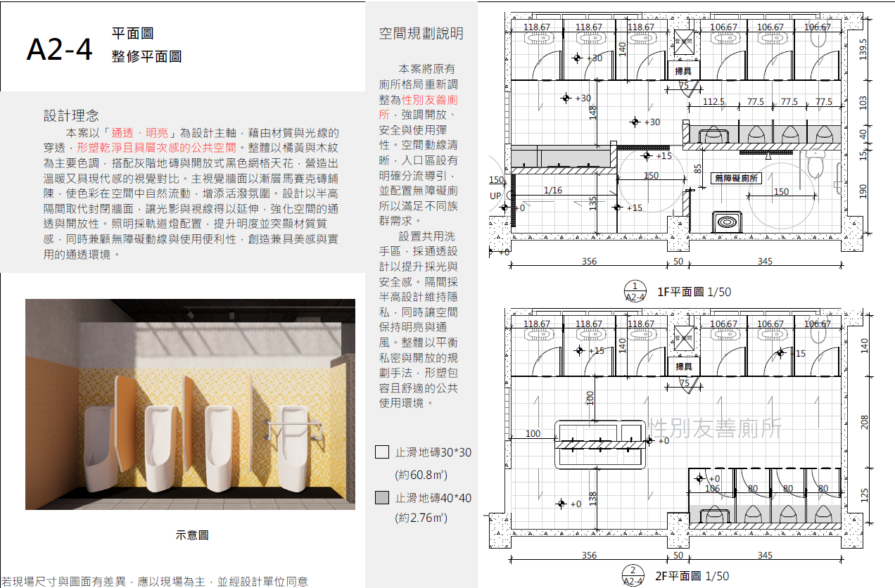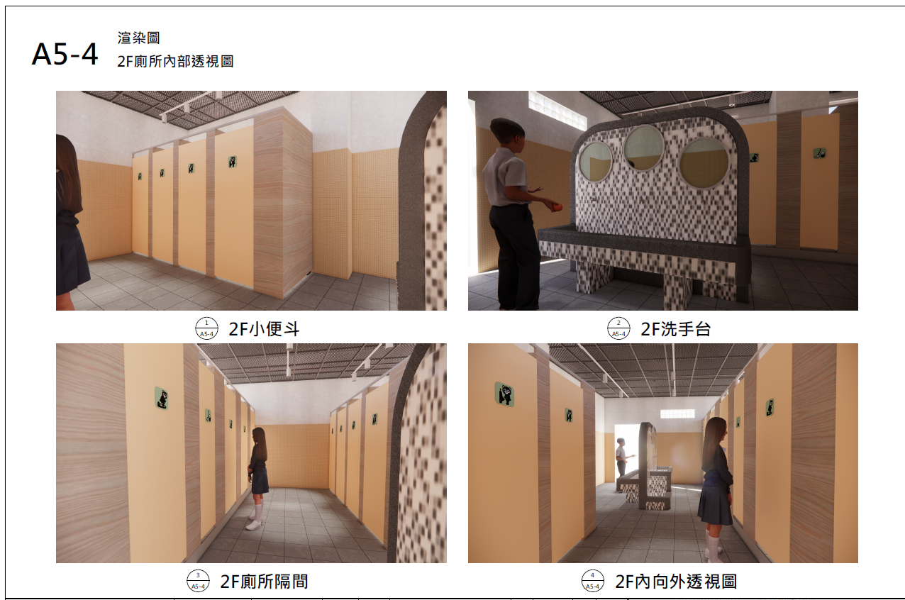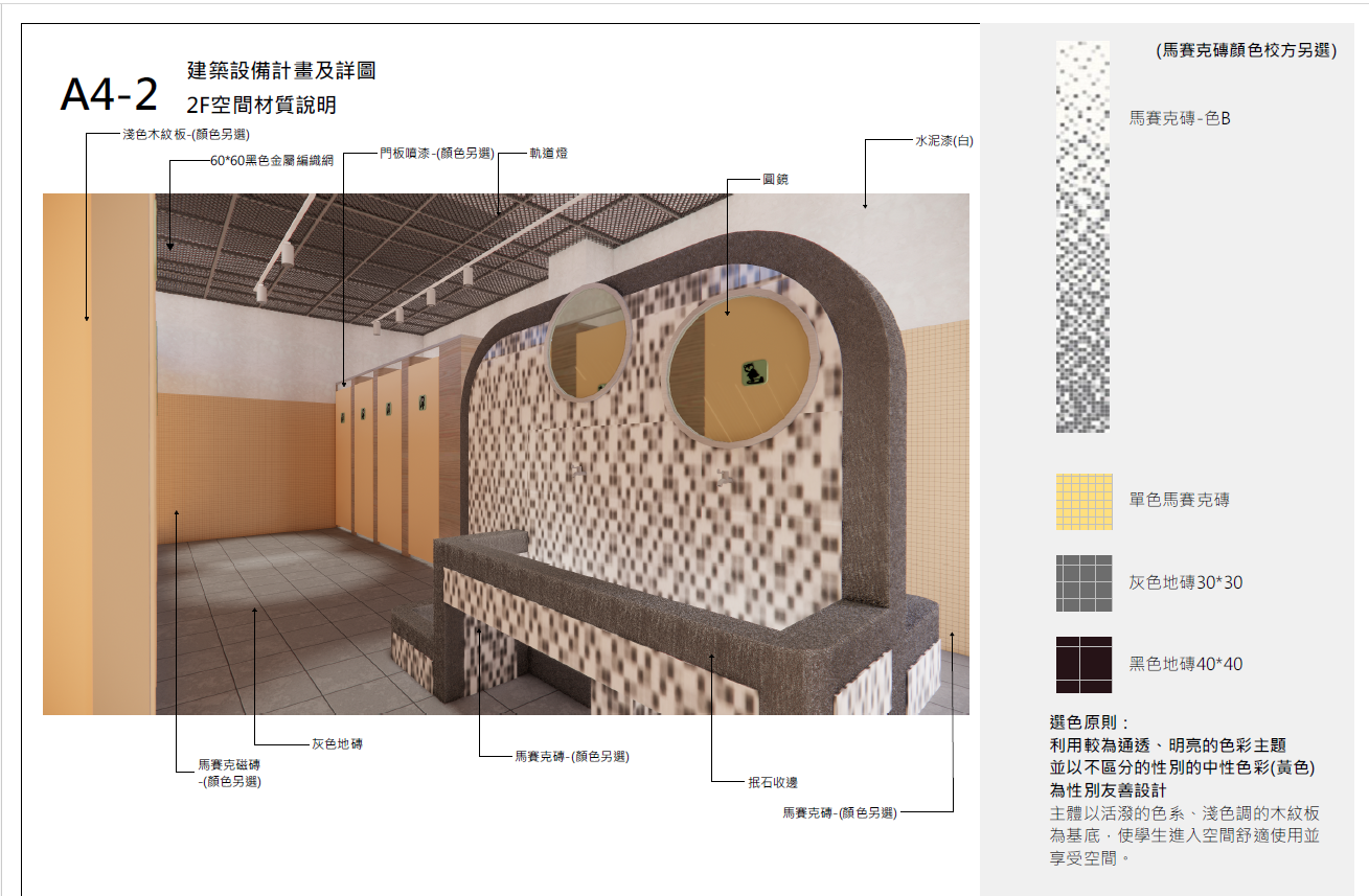 本案以 「通透、明亮、安心、友善」 為主軸,並依活動中心為多功能使用空間之特性,規劃兼具 隱私性、安全性、辨識性與美感性 的性別友善廁所。