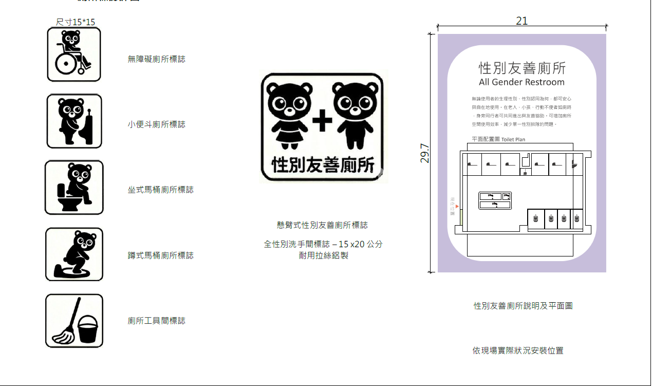 - 包含無障礙、蹲式、坐式、小便斗、清潔間等 15×15 cm 標示。